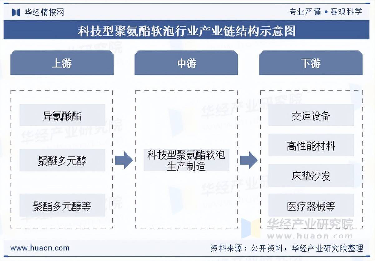 科技型聚氨酯软泡的产业链上游主要涉及异氰酸酯、聚醚多元醇和聚酯多元醇等关键原材料,中游环节制备的科技型聚氨酯软泡主要应于在交运设备、高性能多孔材料制造和日用消费等广泛的下游应用领域。